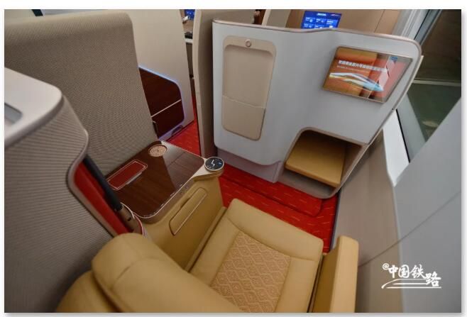 一等座椅增加了可调节头靠、电动腿靠等,将原来设置在座椅扶手上的小桌板改为设置在前排座椅靠背上